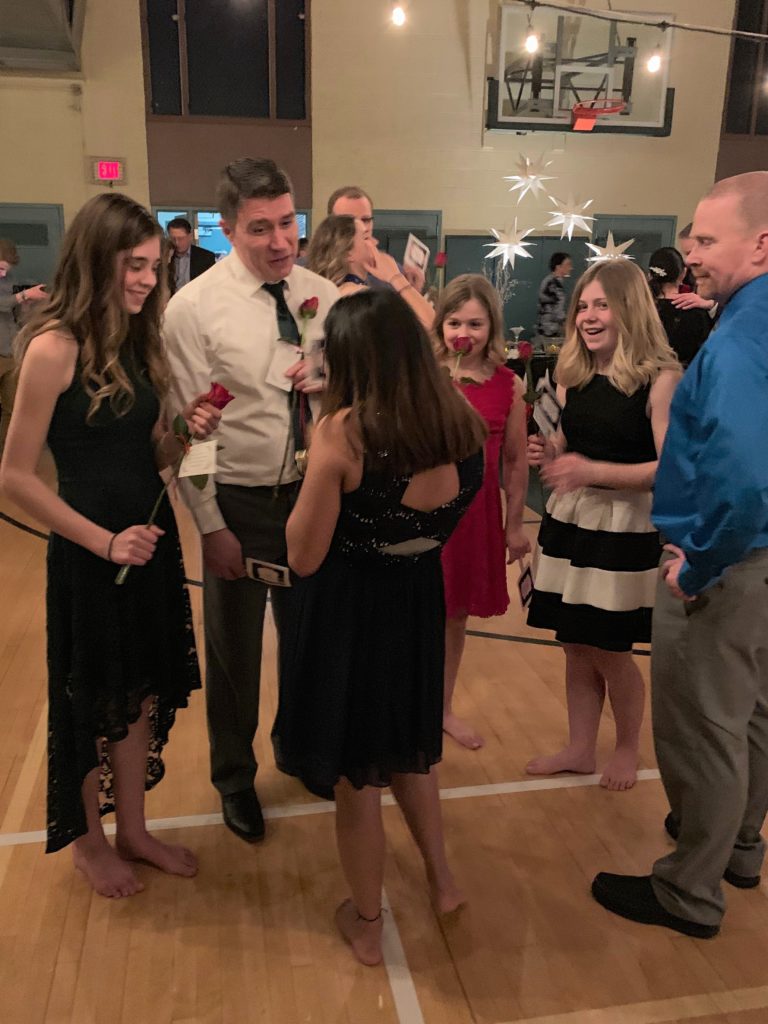 The girls dressed in beautiful gowns and the Small Gym was transformed into a lovely ballroom by the design expertise of Robyn Dawson. The Magic Mouse DJ (NWCS Mom, Meigan Tunison) played fun music from a variety of decades. Mr. Rick Taylor and his sons provided dance lessons in the art of Swing, Waltz, and Line Dancing. Every girl received a rose from her “date” and spent time in prayer. There was dancing, desserts, photographs, lights and games which brought much laughter, but the big highlight was when the fog machine blew and all the girls screamed in delight!