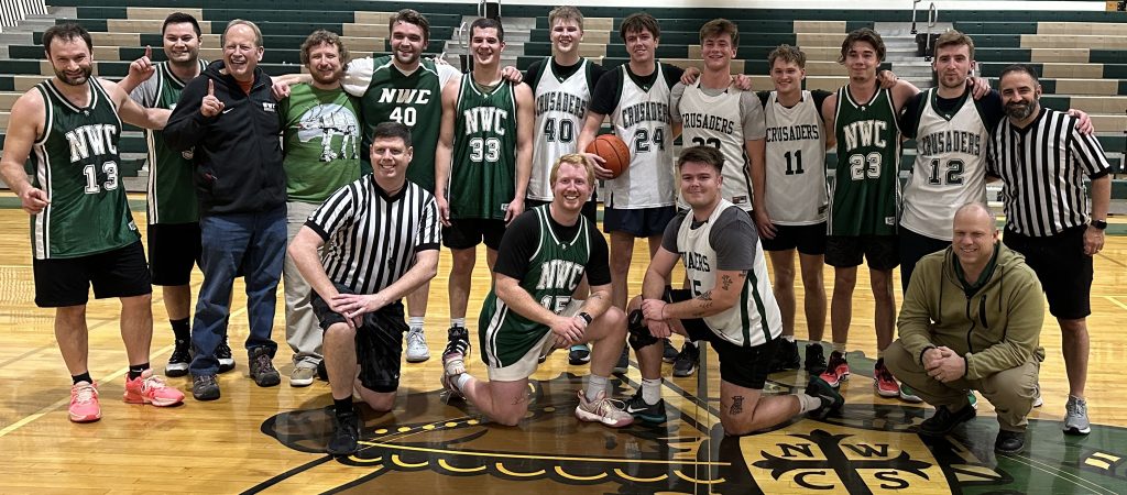 Friday, December 15th, was Alumni Night at the basketball games. The evening’s theme was vintage night and Crusader fans could purchase past athletic jerseys for only $5! Alumni received complimentary admission to the games and a coupon for a free popcorn and soda. Both girls’ and boys’ varsity teams started the night off with wins over the Kettle Falls Bulldogs, but the most anticipated event was the alumni basketball game. The bleachers were packed with fans and students as twelve players in old school uniforms stepped onto the Crusader court to play in the night’s final match up! Matt Halpin (2003) was the game’s announcer and with flash and flair, he introduced the players. With only two substitutions between the two teams the game was a battle of gut and grit! The green “NWC” team, coached by Aaron Spuler (NWCS boys varsity coach), quickly jumped ahead and maintained the lead going into the second half. However, Coach Tim Hansen’s (1978) white “Crusaders” team battled back in the second half. With some questionable calls from guest officials, Joel Murphy (1995) and John Fazio, and an allegedly dysfunctional score board manned by future alum Zach Wing (Class of 2024), the teams were neck and neck to the very end. The battle was epic and at the final buzzer the players were empty. The 2023 NWCS Alumni Night at the basketball games was spectacular. Filled with fun, family, and friends the evening was a win for everyone!