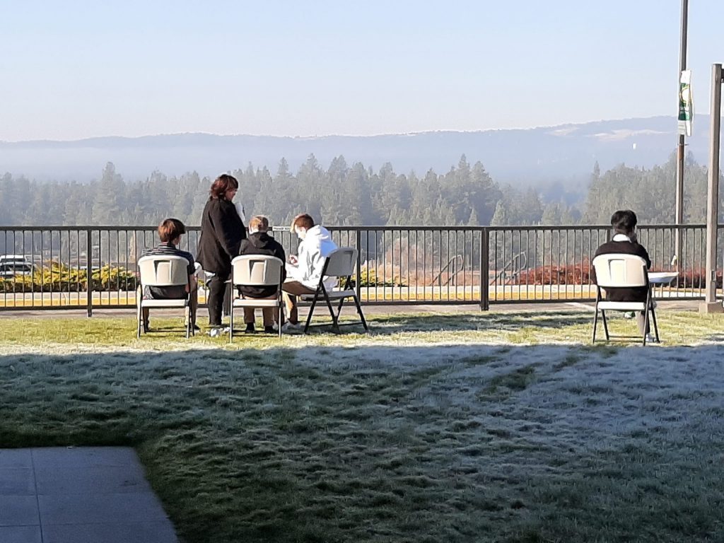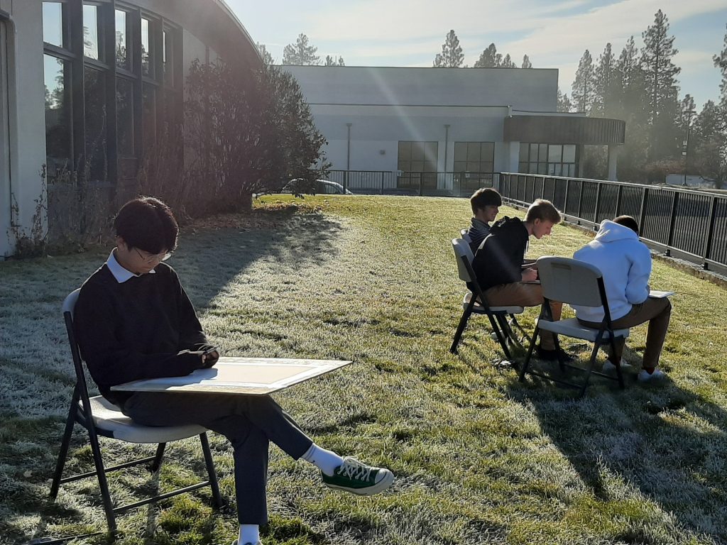This morning I noticed Deb Sinclair’s class out side looking out across the beautiful valley in front of the school, sketching for art class. The interesting thing about it was, as I focused on running out to grab pictures, I was listening to Deb’s gentle and encouraging instructions to the students. “As you look out, don’t capture the fog that comes from your breath and runs over your view. Look at the sky, the frost on the ground”. Everyone was engaged, talking, discussing what they were seeing, what their perspective was from where they were sitting. I could tell their experience was one that opened up all of the senses and allowed their minds to run away with creativity. Sitting outside with a blanket around their shoulders, breathing in the beauty and fresh air. Feeling the breeze, sun, the day upon them. Quiet, pondering how creation and humanity comes together to create art. What a beautiful way to start of the school day!