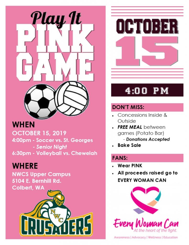 NWCS’ Crusader Club will provide a FREE Potato Bar meal between games (donations will be accepted) as well as concessions and a bake sale. All proceeds raised will go to the Every Woman Can organization.