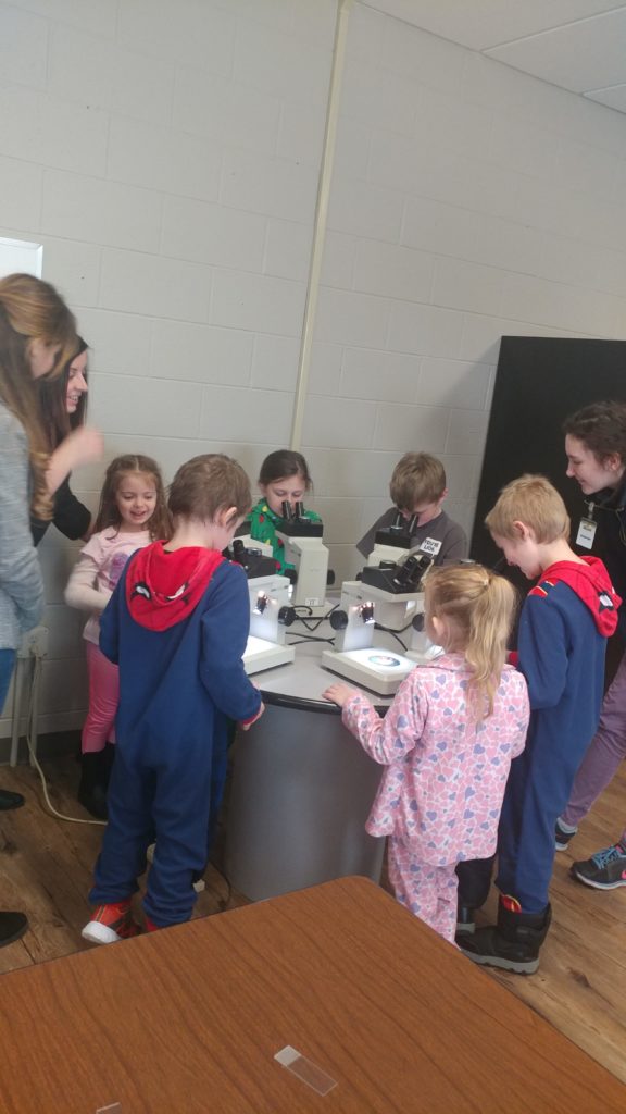 Cedar students gather round to look at objects up close in the microscopes.